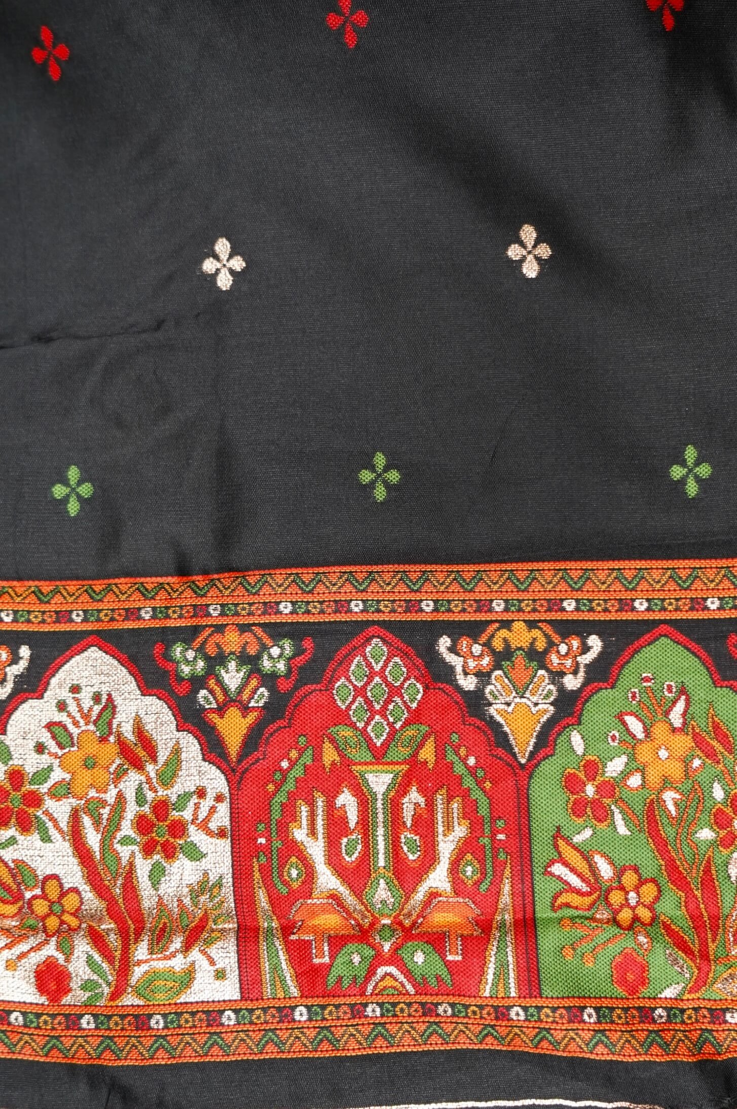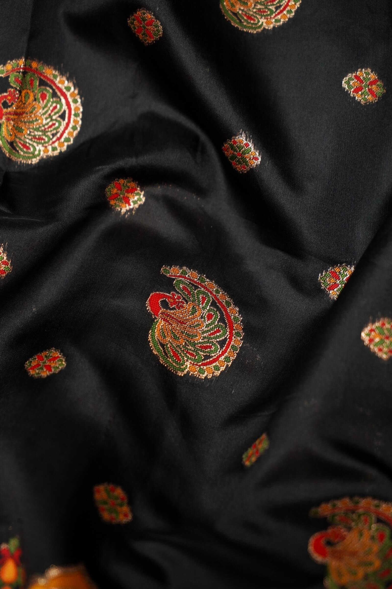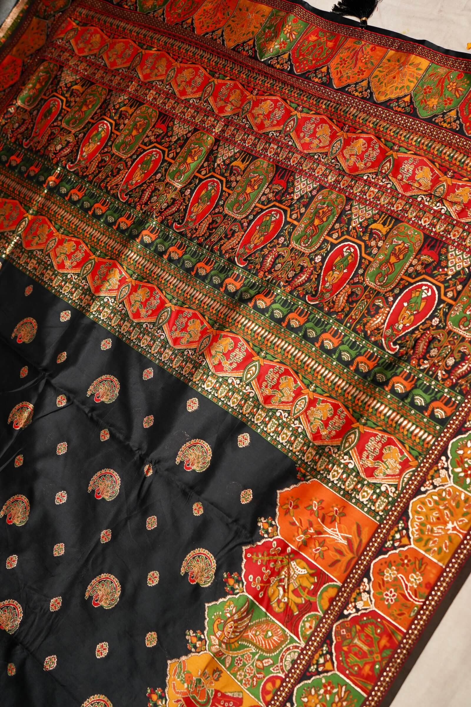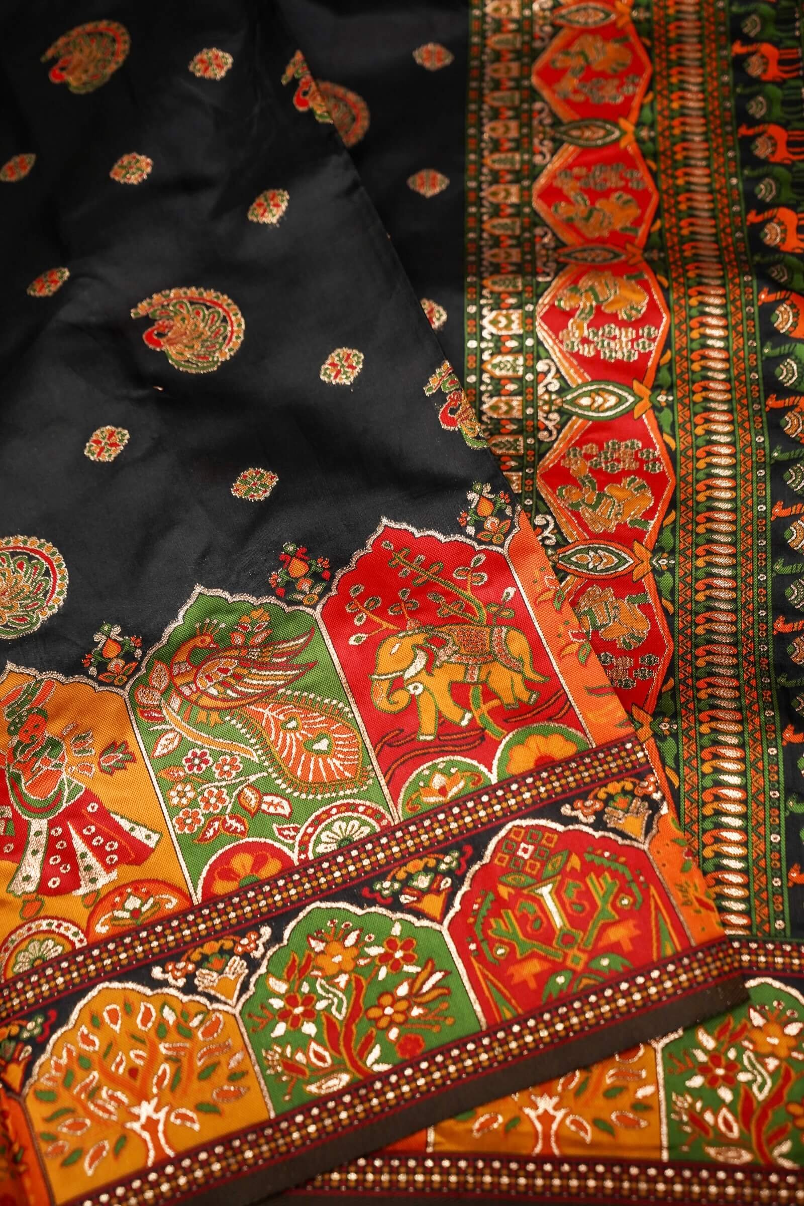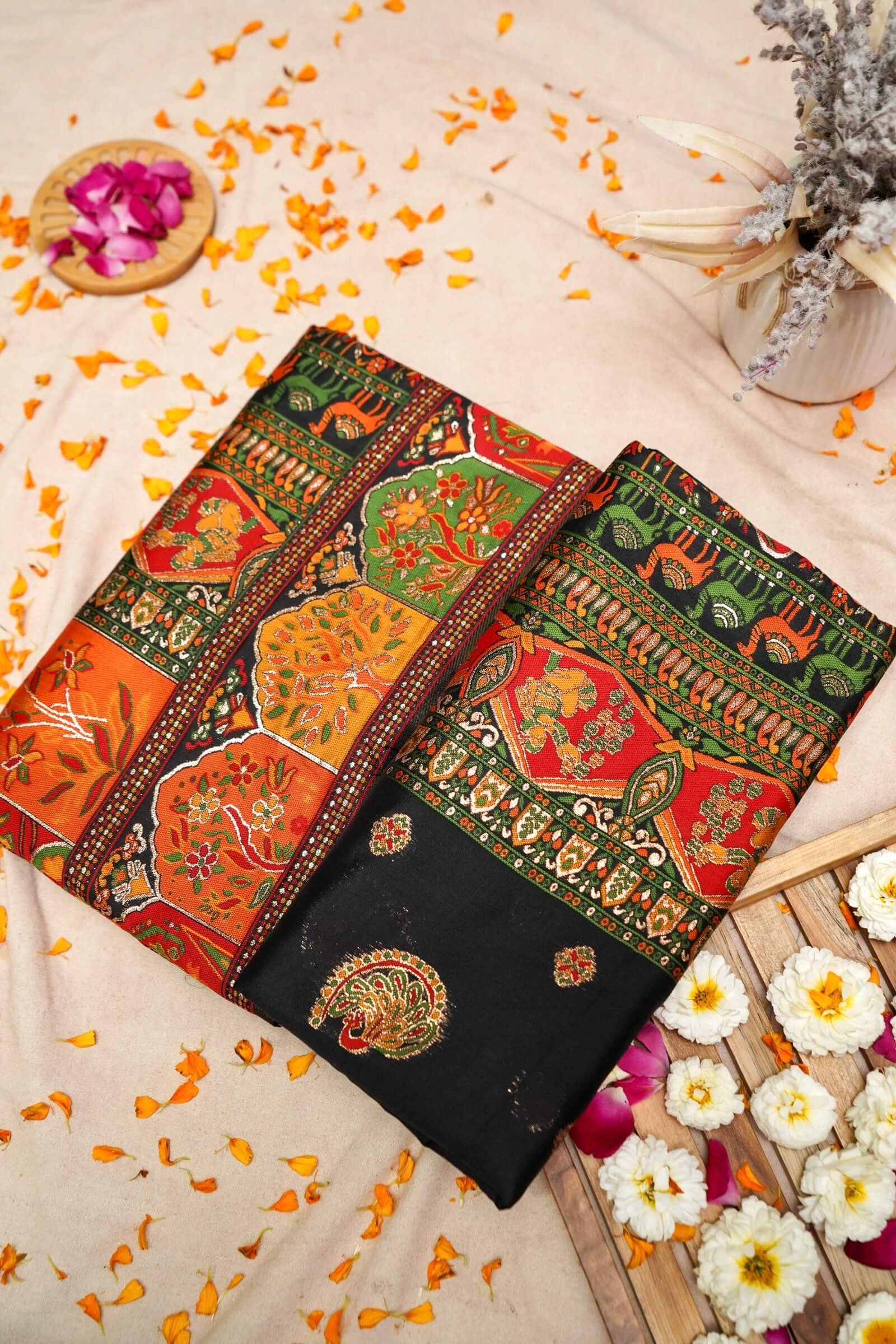This striking art silk saree in a deep black base showcases intricate Pashmina-inspired designs that reflect rich cultural artistry. The beautifully detailed border features vibrant peacock and elephant motifs, adding a regal and storytelling charm. Accentuated with colorful patterns and fine detailing, it creates a bold yet elegant look. The smooth texture ensures a graceful drape, making it perfect for festive occasions and celebrations with timeless sophistication.