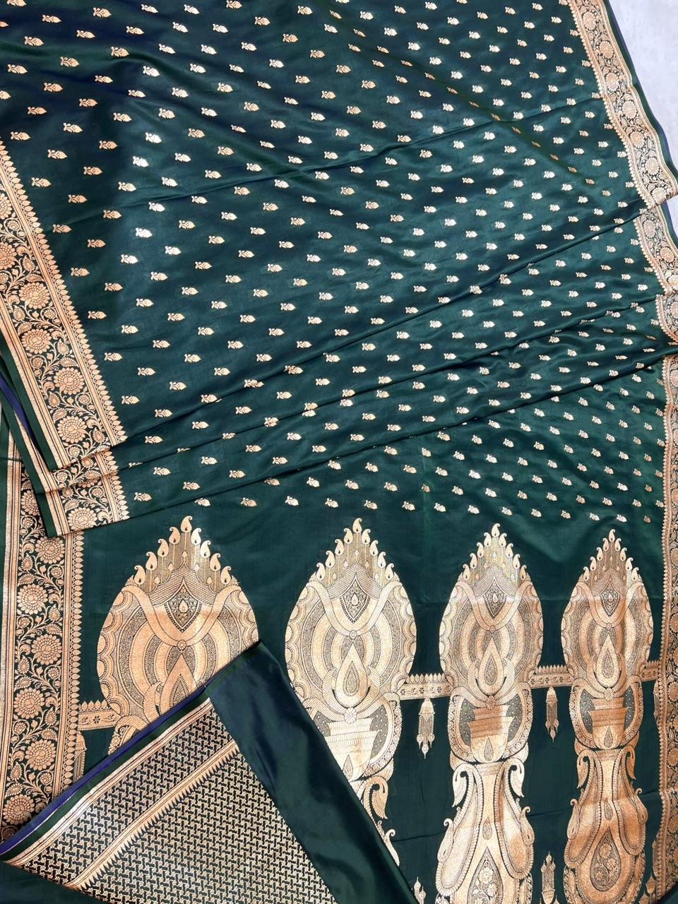 Embrace timeless luxury with this premium Banarasi Mashru Katan silk saree in a deep emerald tone. Adorned with elegant all-over weaving and delicate motifs, it offers a rich and graceful appeal. The beautifully crafted pallu features intricate zari work, adding depth and grandeur to the overall look. Paired with a matching brocade blouse piece, this saree is perfect for festive occasions, weddings, and sophisticated celebrations.