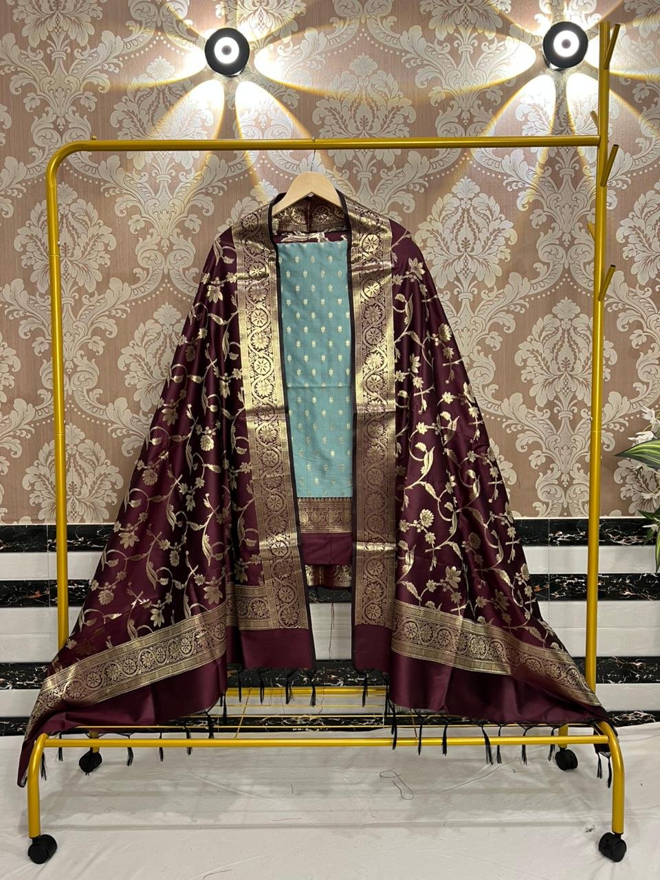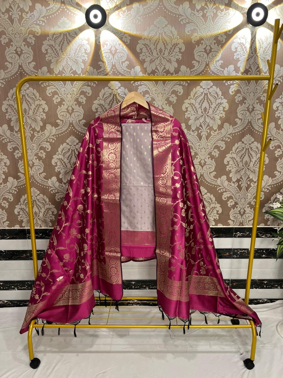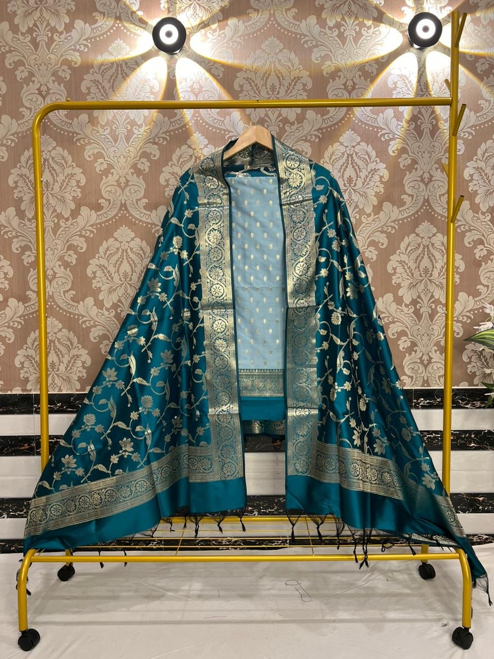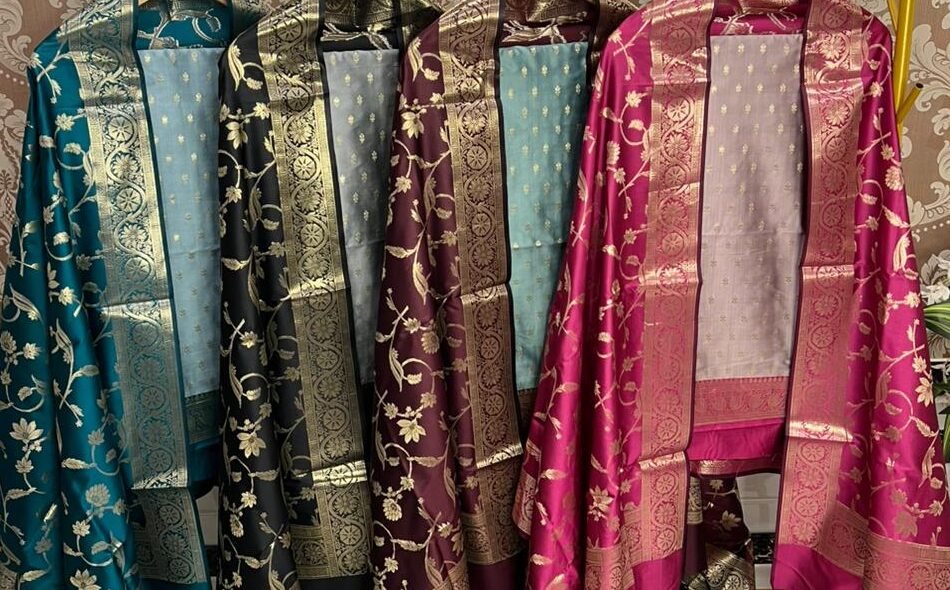 Technique: Woven in premium Banarasi silk, featuring fine zari buti motifs on the top and an intricately detailed jaal weave dupatta with traditional contrast borders.