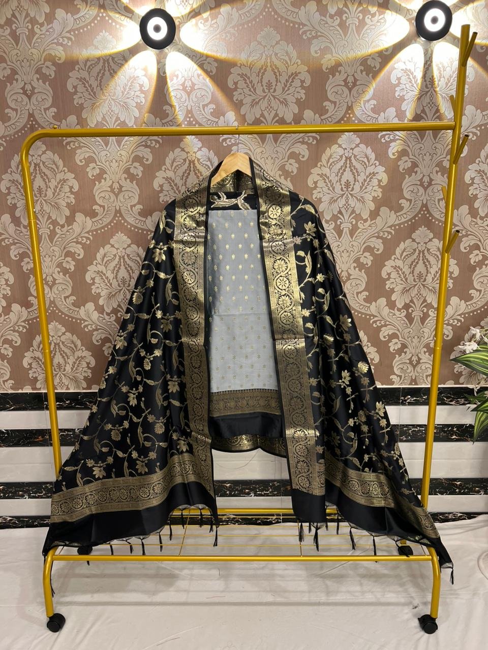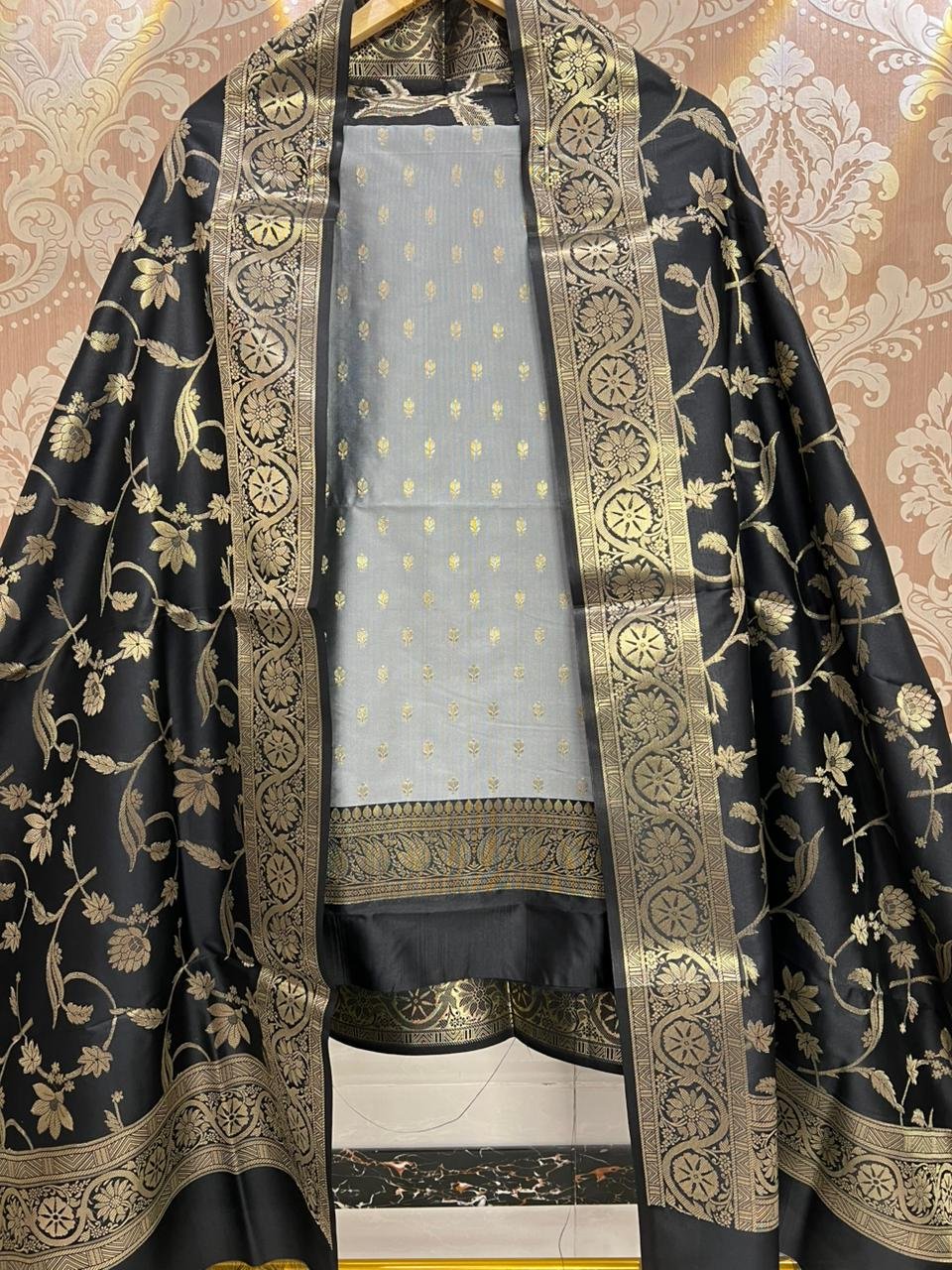 A striking blend of elegance and contrast, this Banarasi soft silk suit set brings timeless sophistication to your wardrobe. The grey silk top is adorned with delicate zari buti weaving and finished with a rich contrast border for added depth. Paired with a luxurious black Banarasi silk dupatta featuring intricate jaal weaving, it creates a bold yet graceful statement. Completed with a plain silk bottom, this ensemble is perfect for refined festive and evening occasions.