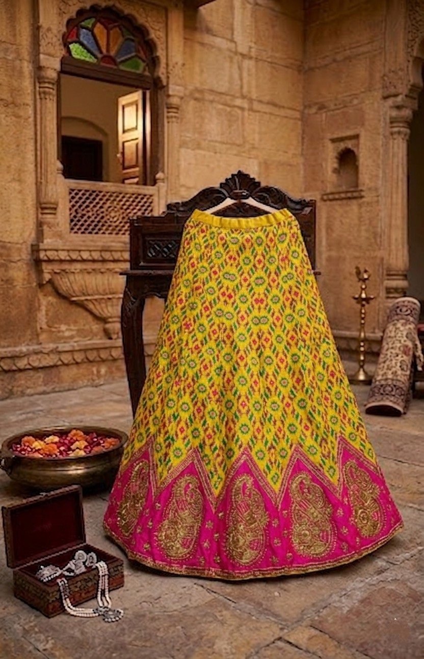 Bright and festive, this haldi-yellow lehenga set features a vibrant Patola-inspired skirt paired with a beautifully crafted blouse adorned in intricate zari and AD work. The design blends traditional patterns with subtle embellishments for a rich yet lively look. Completed with a lightweight net dupatta, this ensemble is enhanced with a can-can skirt for graceful volume, making it a perfect choice for haldi ceremonies and cheerful festive occasions.