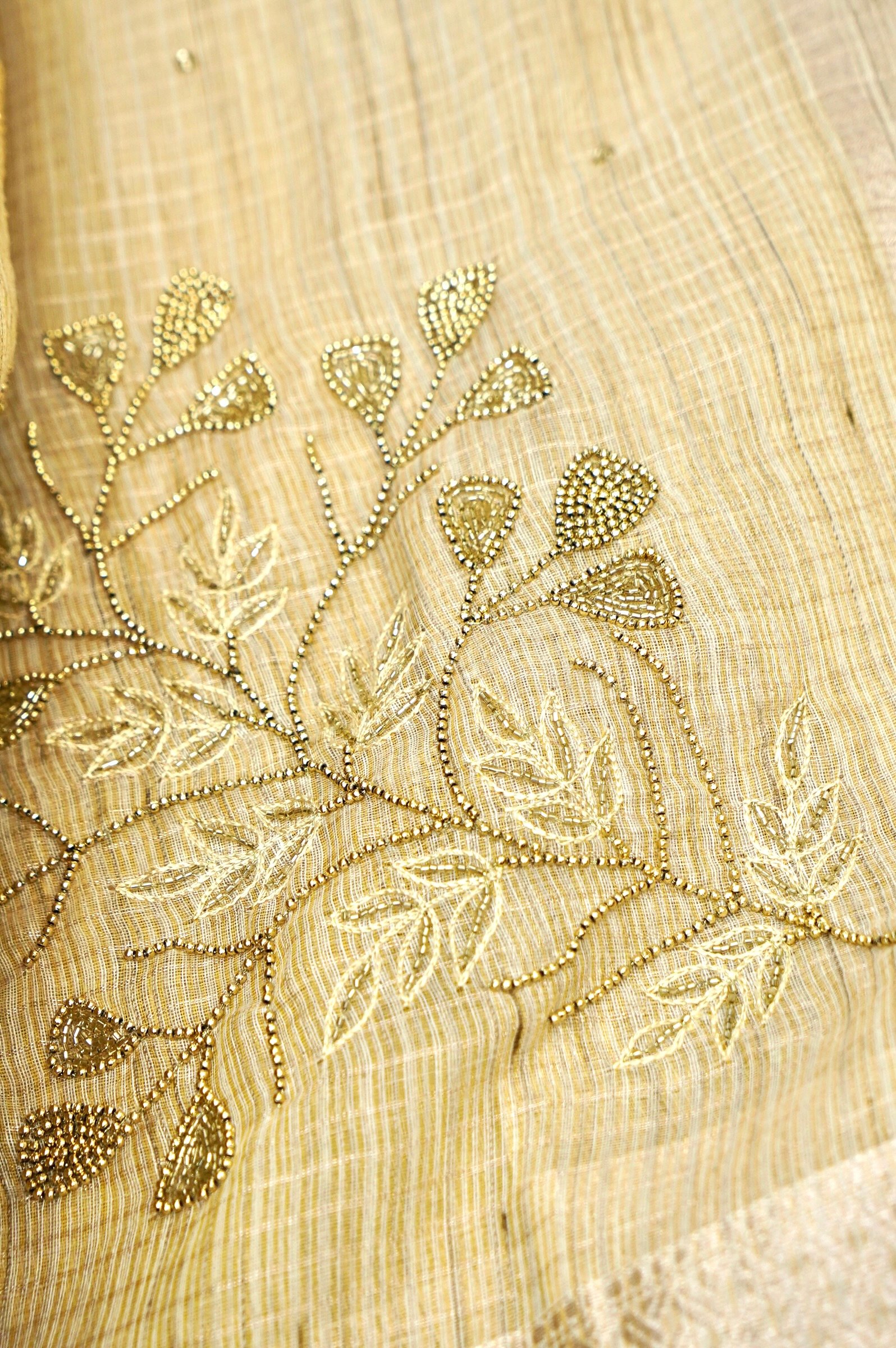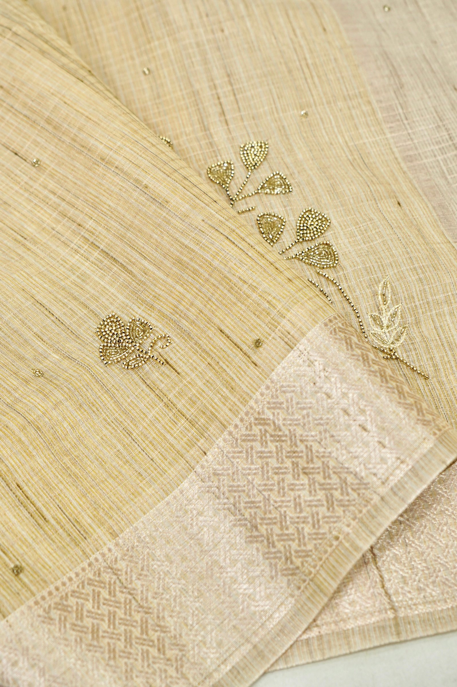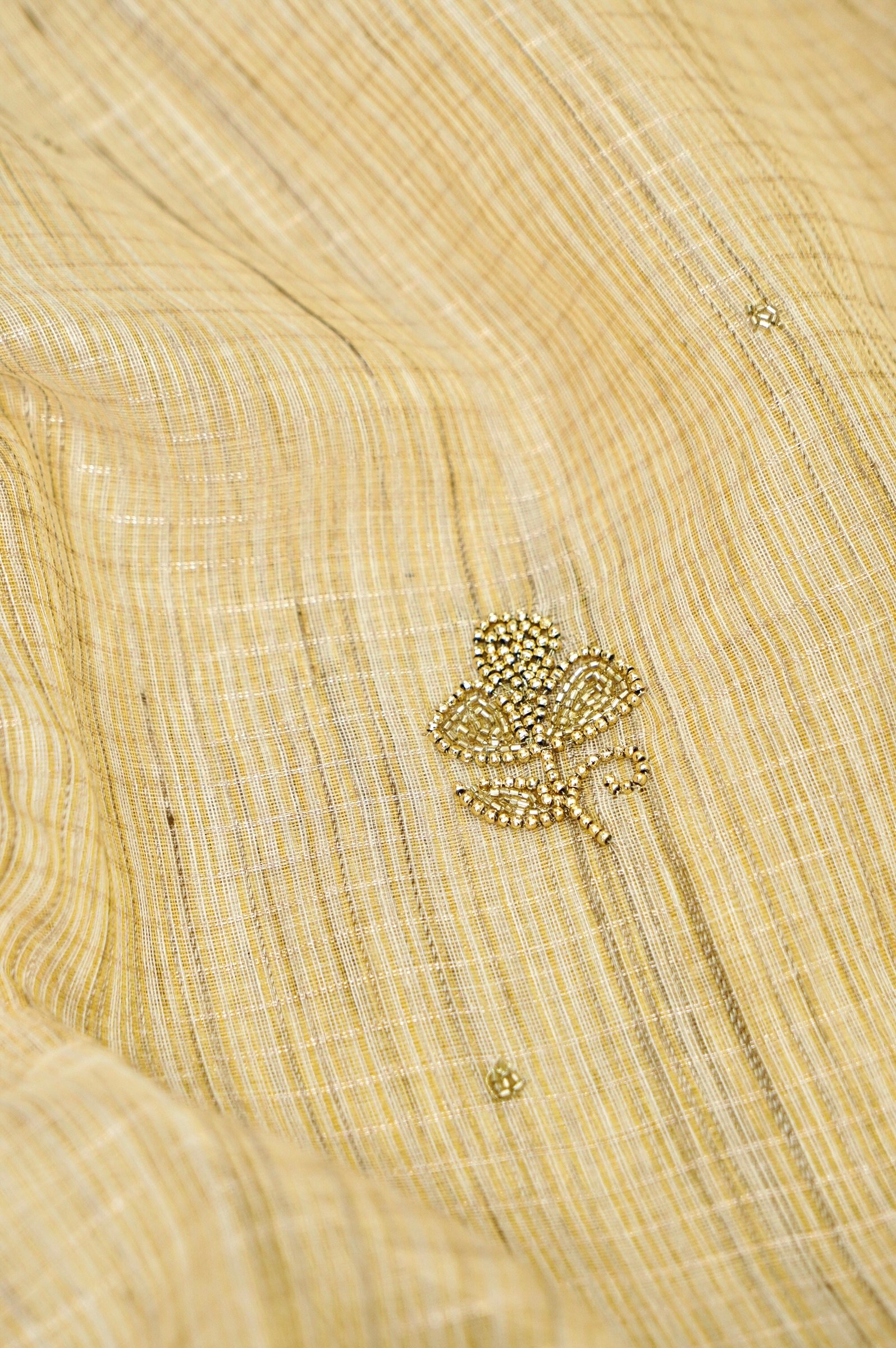 Soft and ethereal, this pastel golden linen cotton saree is crafted for understated elegance. Its lightweight, slightly sheer texture drapes effortlessly, while delicate Banarasi-inspired motifs are hand-embellished with fine sequins and subtle AD stone detailing. The gentle shimmer enhances its refined charm without overpowering the look. Perfect for daytime festivities and intimate occasions, this saree offers a graceful blend of modern minimalism and traditional artistry.