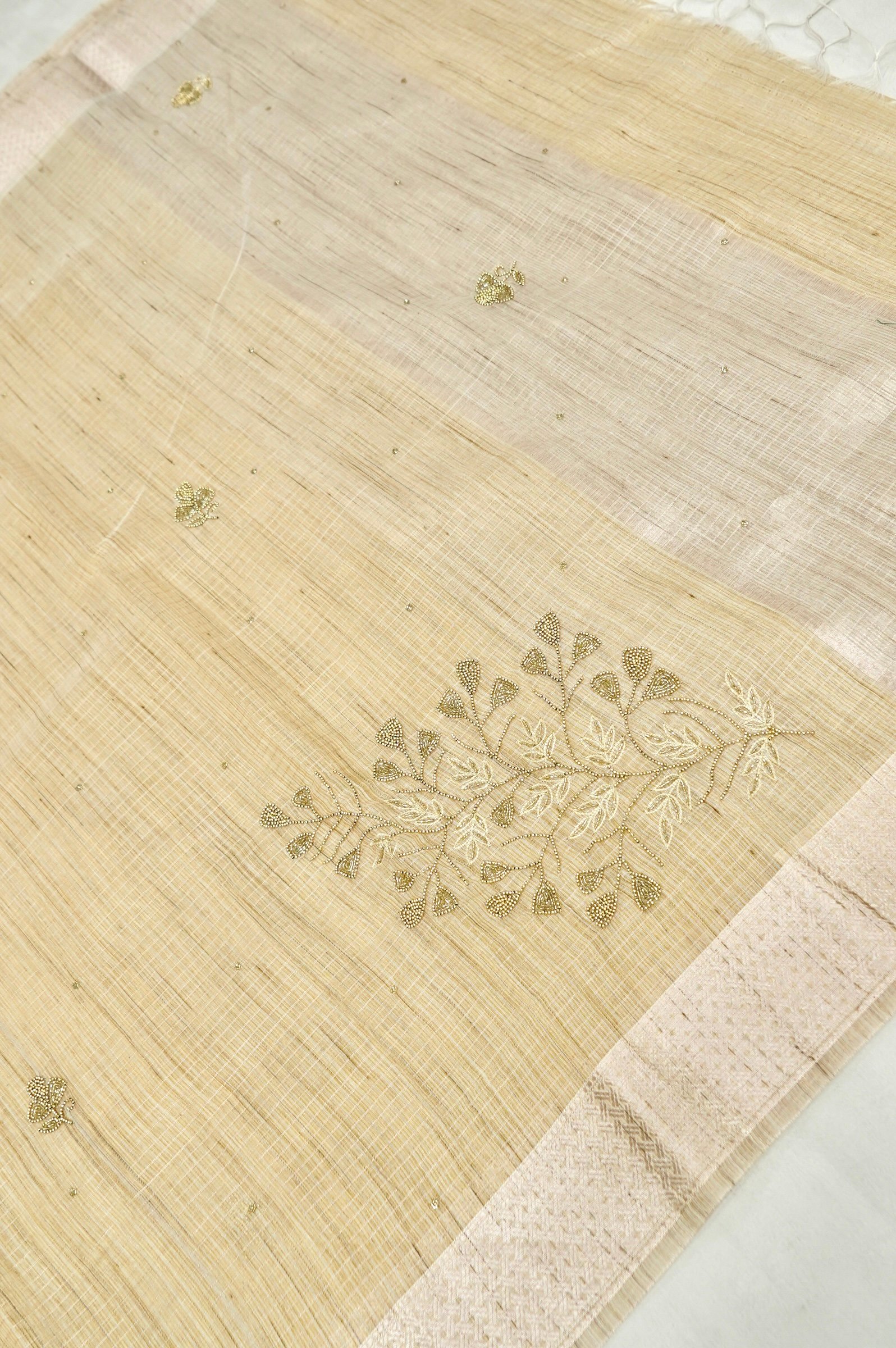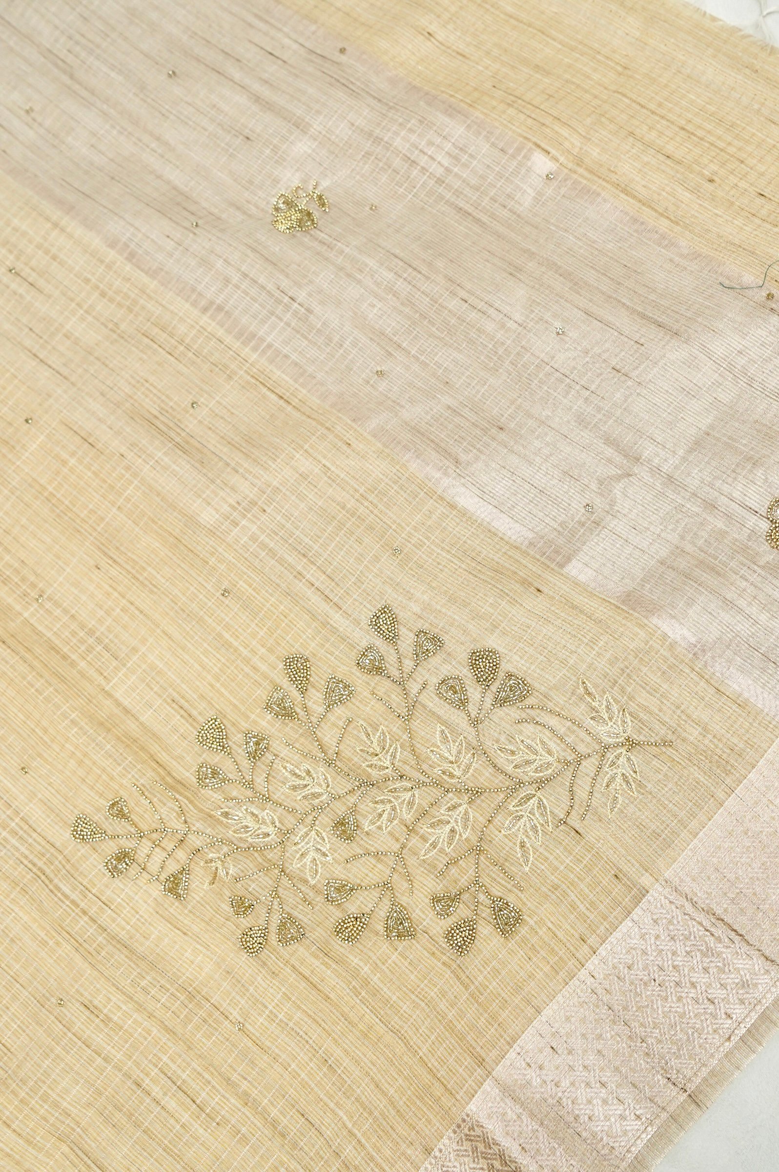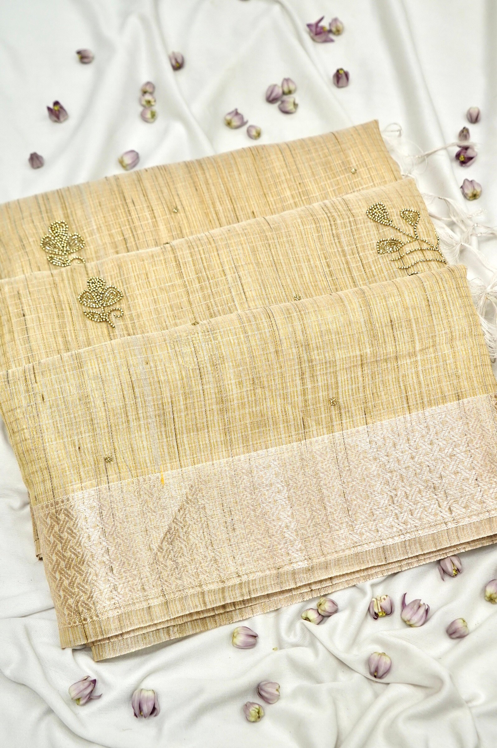 Soft and ethereal, this pastel golden linen cotton saree is crafted for understated elegance. Its lightweight, slightly sheer texture drapes effortlessly, while delicate Banarasi-inspired motifs are hand-embellished with fine sequins and subtle AD stone detailing. The gentle shimmer enhances its refined charm without overpowering the look. Perfect for daytime festivities and intimate occasions, this saree offers a graceful blend of modern minimalism and traditional artistry.