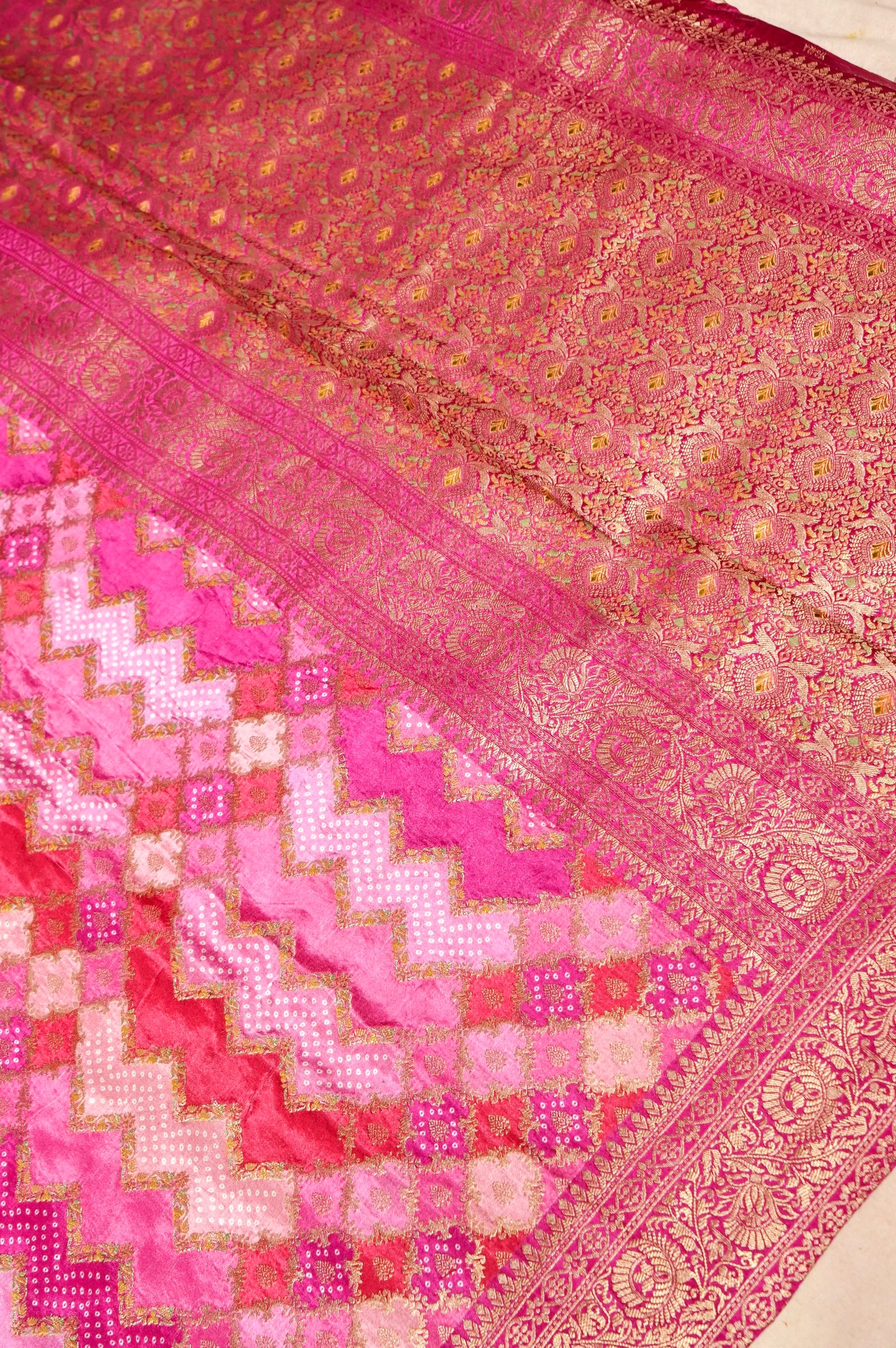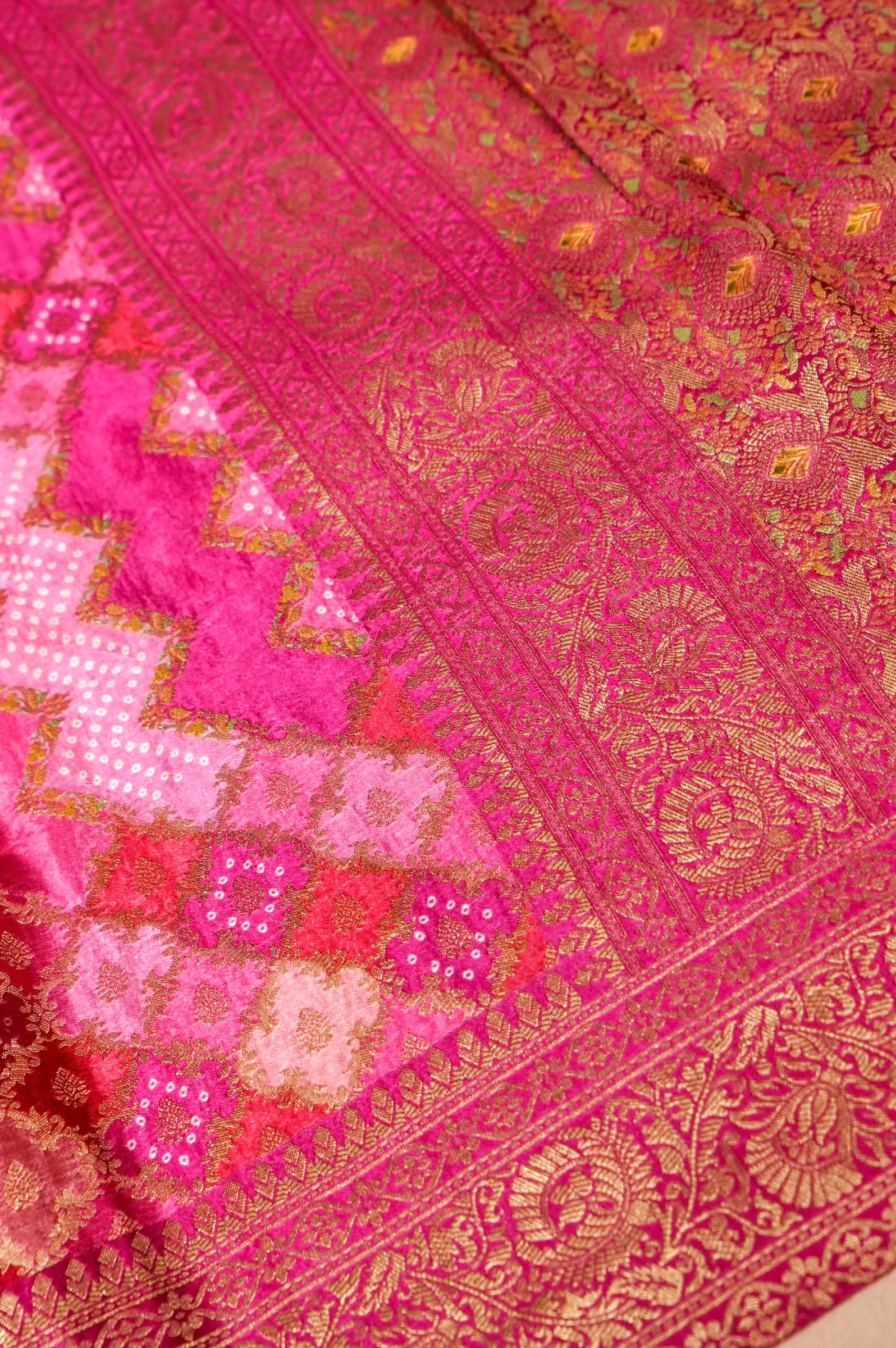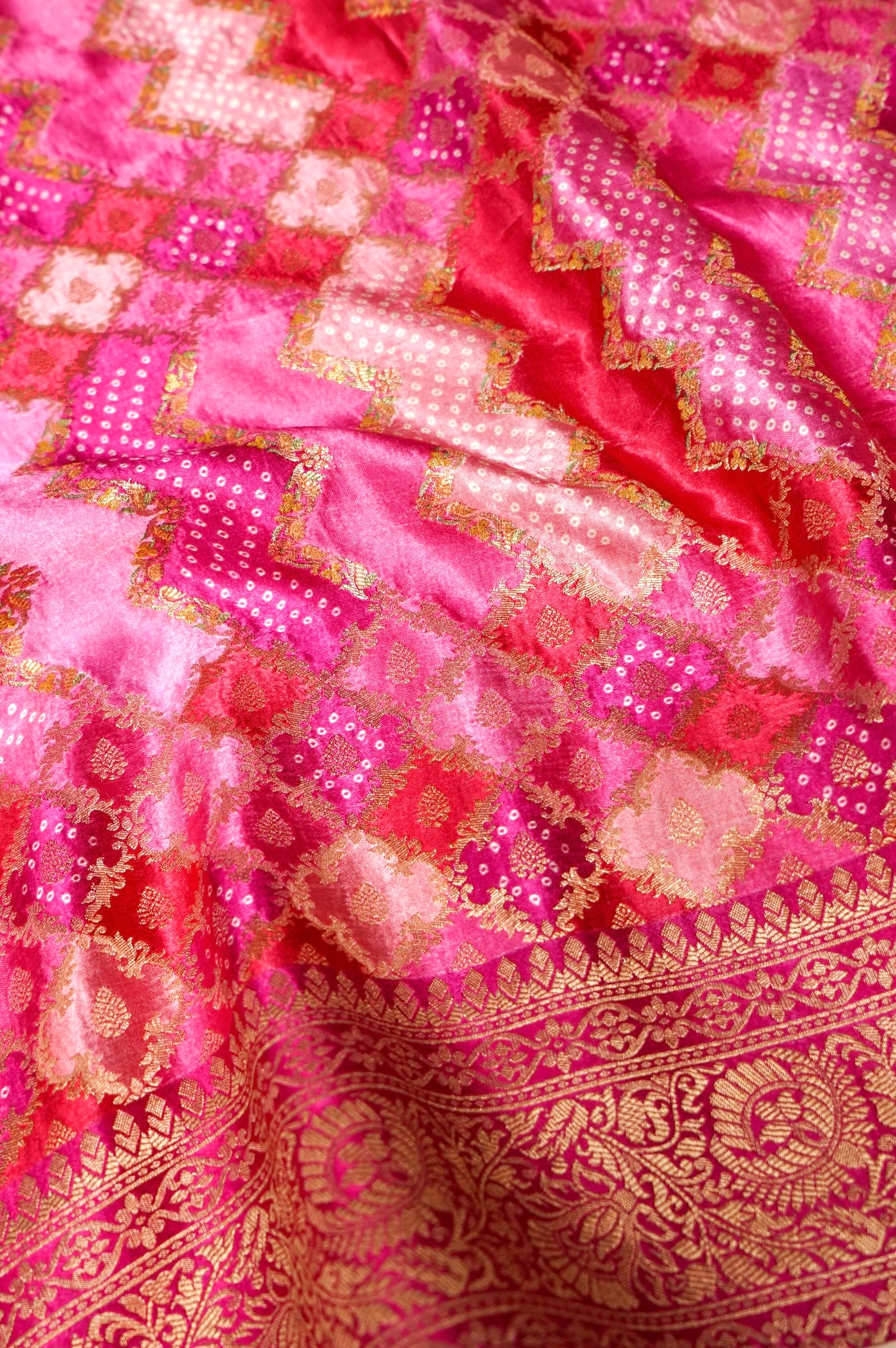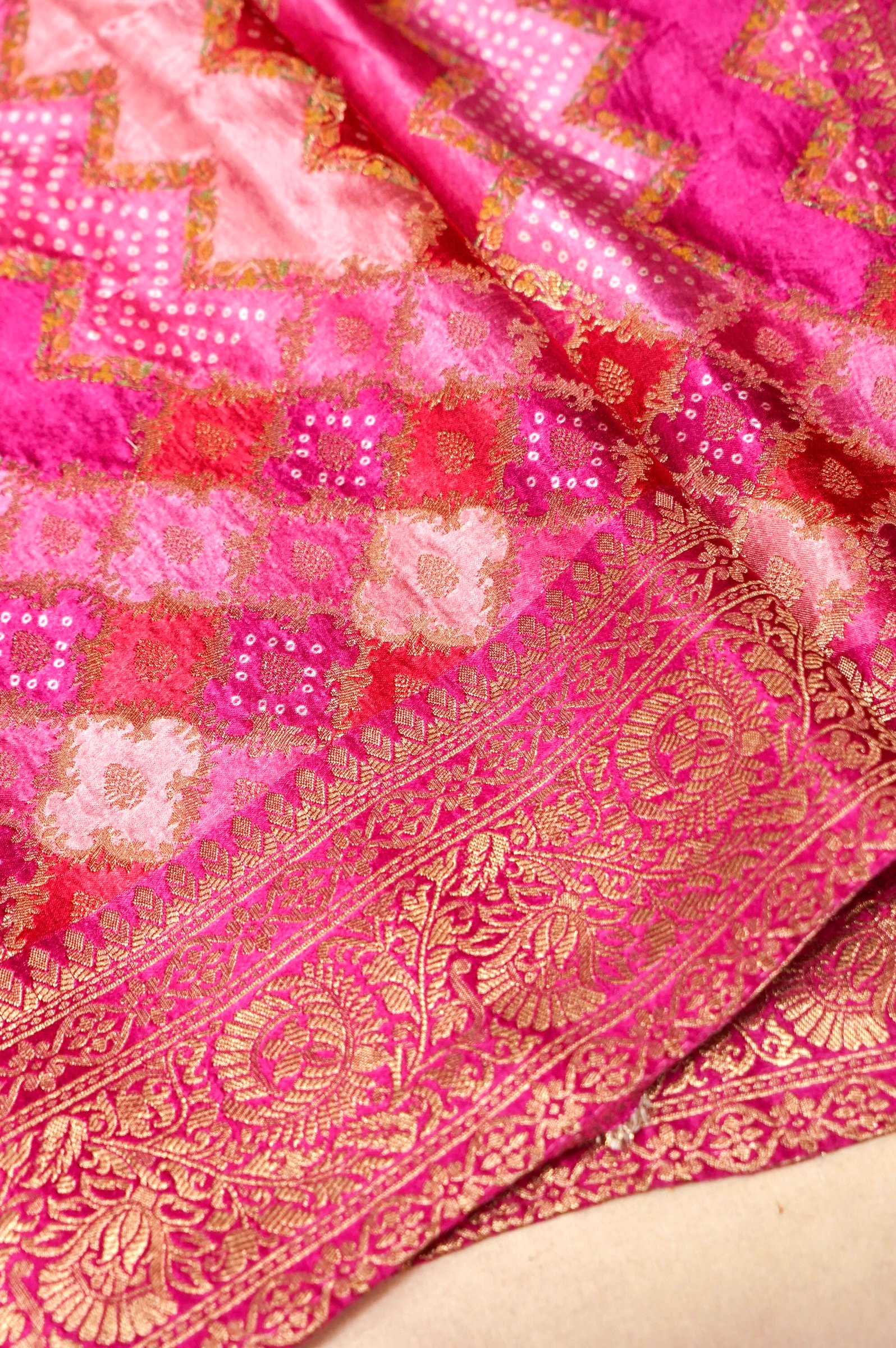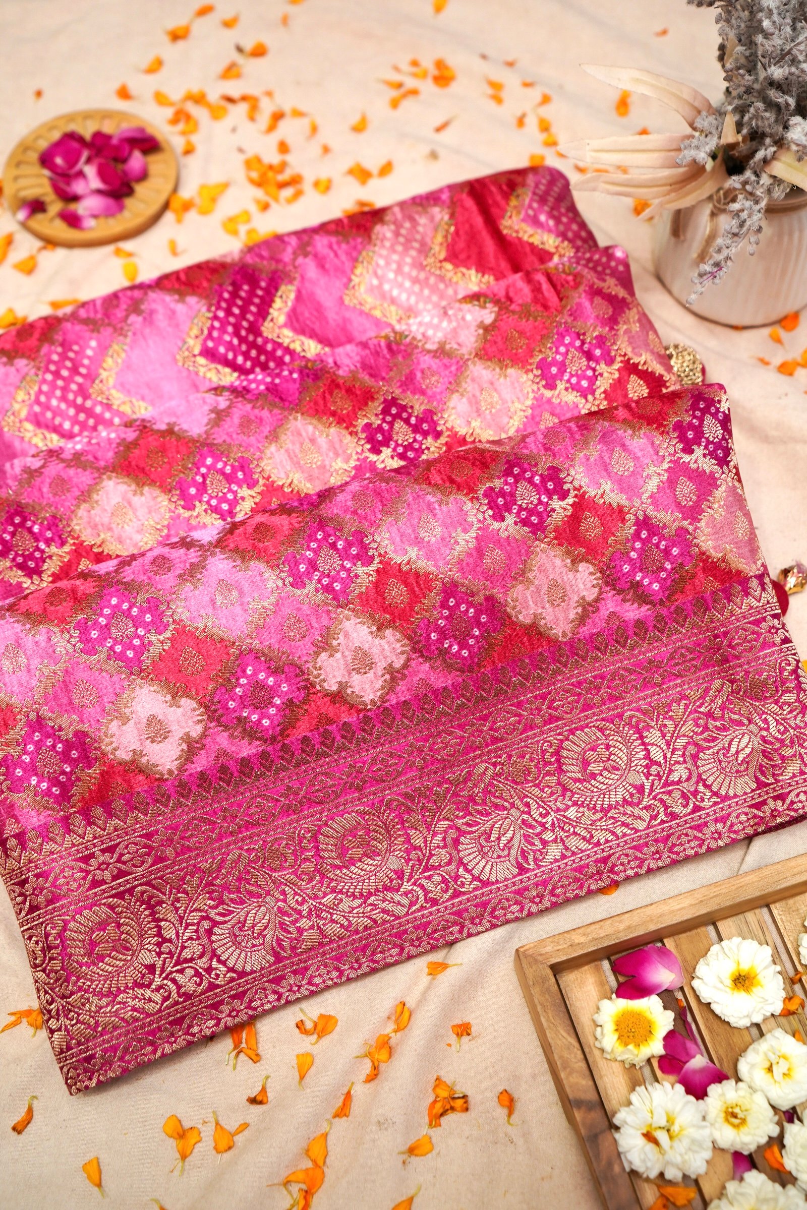 Technique: Crafted with Bandhani-inspired pattern weaving, the saree features intricate zari work across the body along with a finely detailed Banarasi border, ensuring richness and precision.