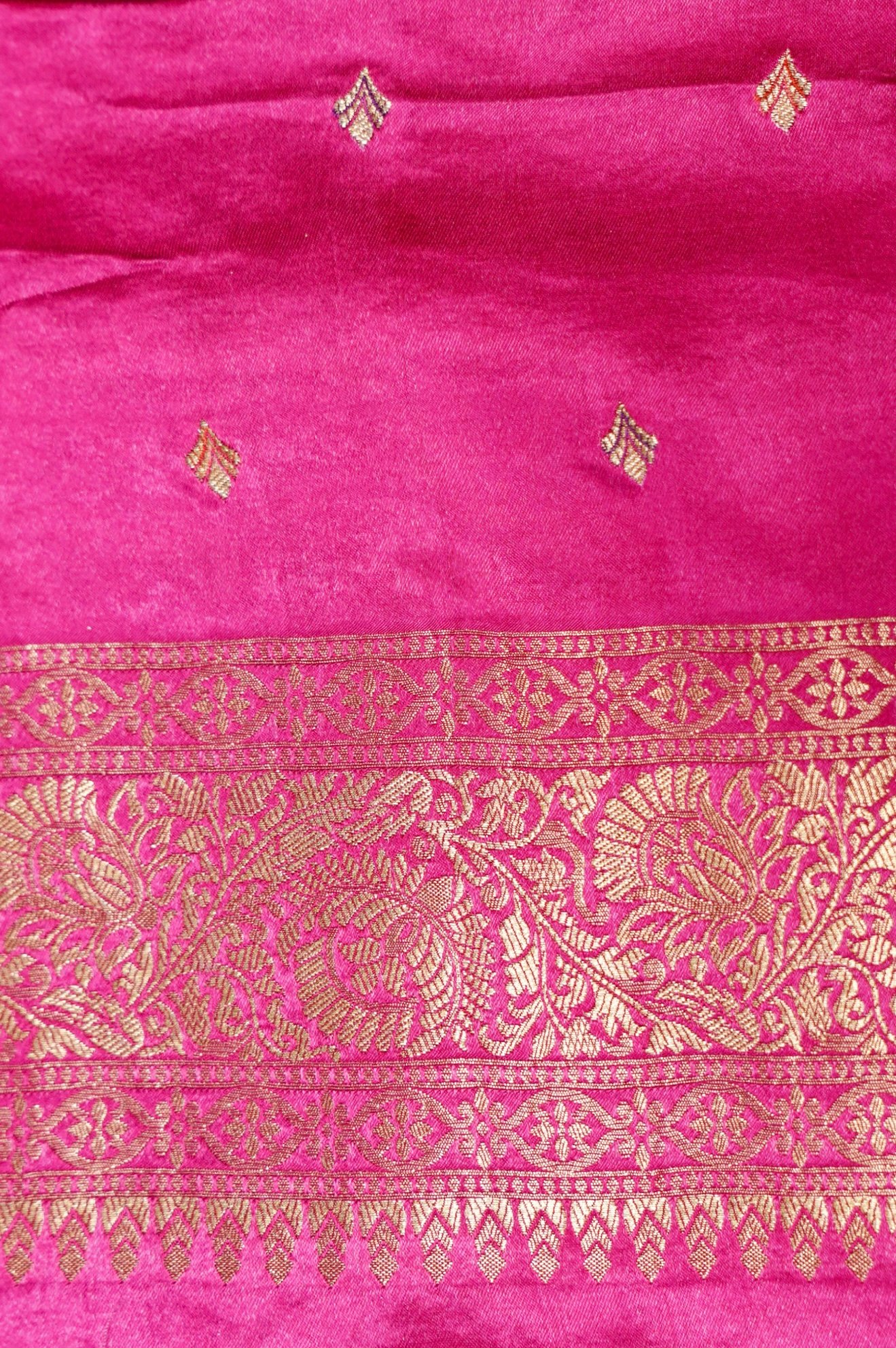 This exquisite Gajji silk saree in a vibrant pink hue showcases intricate Bandhani-inspired patterns beautifully enhanced with rich golden zari work throughout. The luxurious texture of Gajji silk offers a soft sheen and an elegant, flowing drape that elevates its overall appeal. Finished with a detailed Banarasi border, the saree exudes timeless charm. Perfect for Indian wedding ceremonies and festive occasions, it reflects classic craftsmanship with refined sophistication.