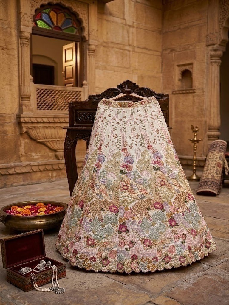 Collection Note: Designed for those who love understated luxury, this lehenga blends soft tones with detailed craftsmanship, offering a graceful and contemporary take on traditional festive wear.